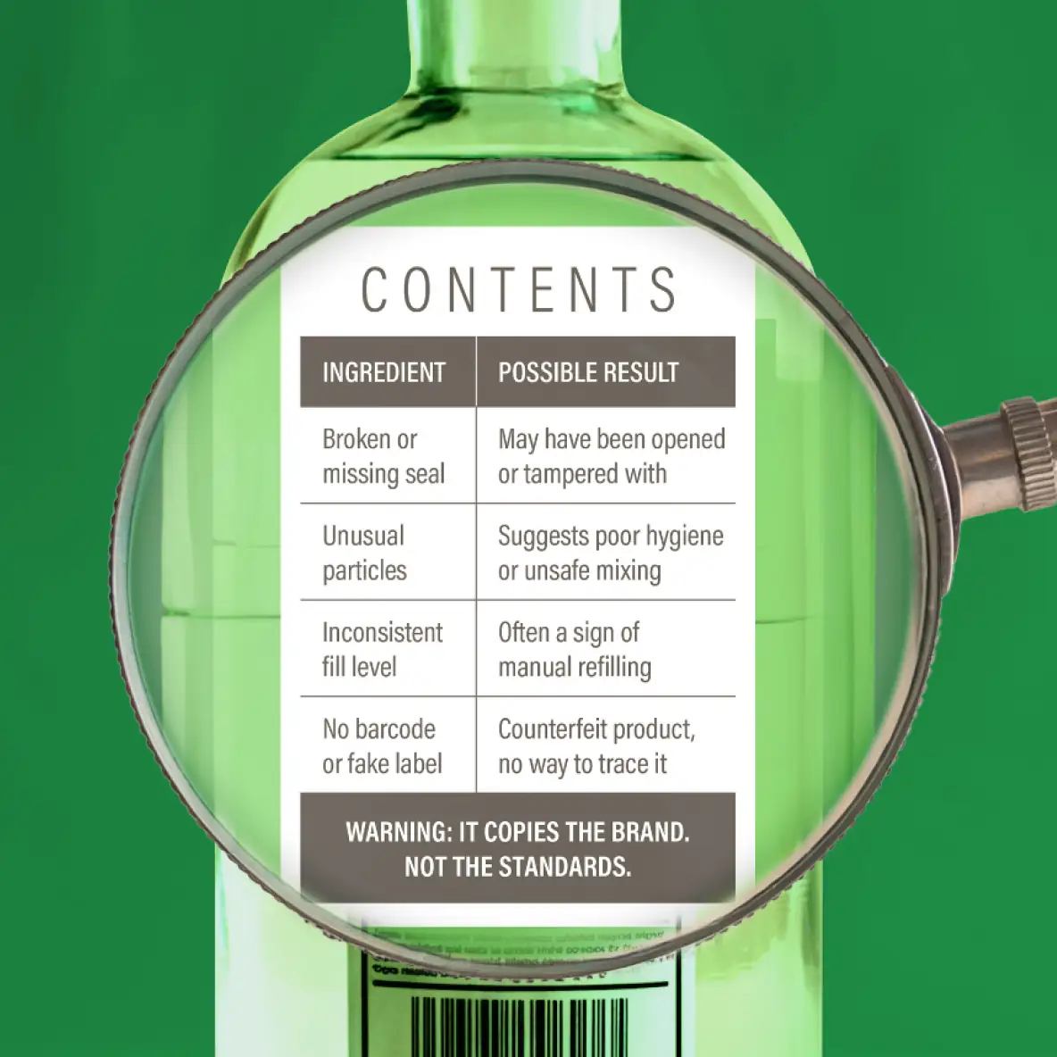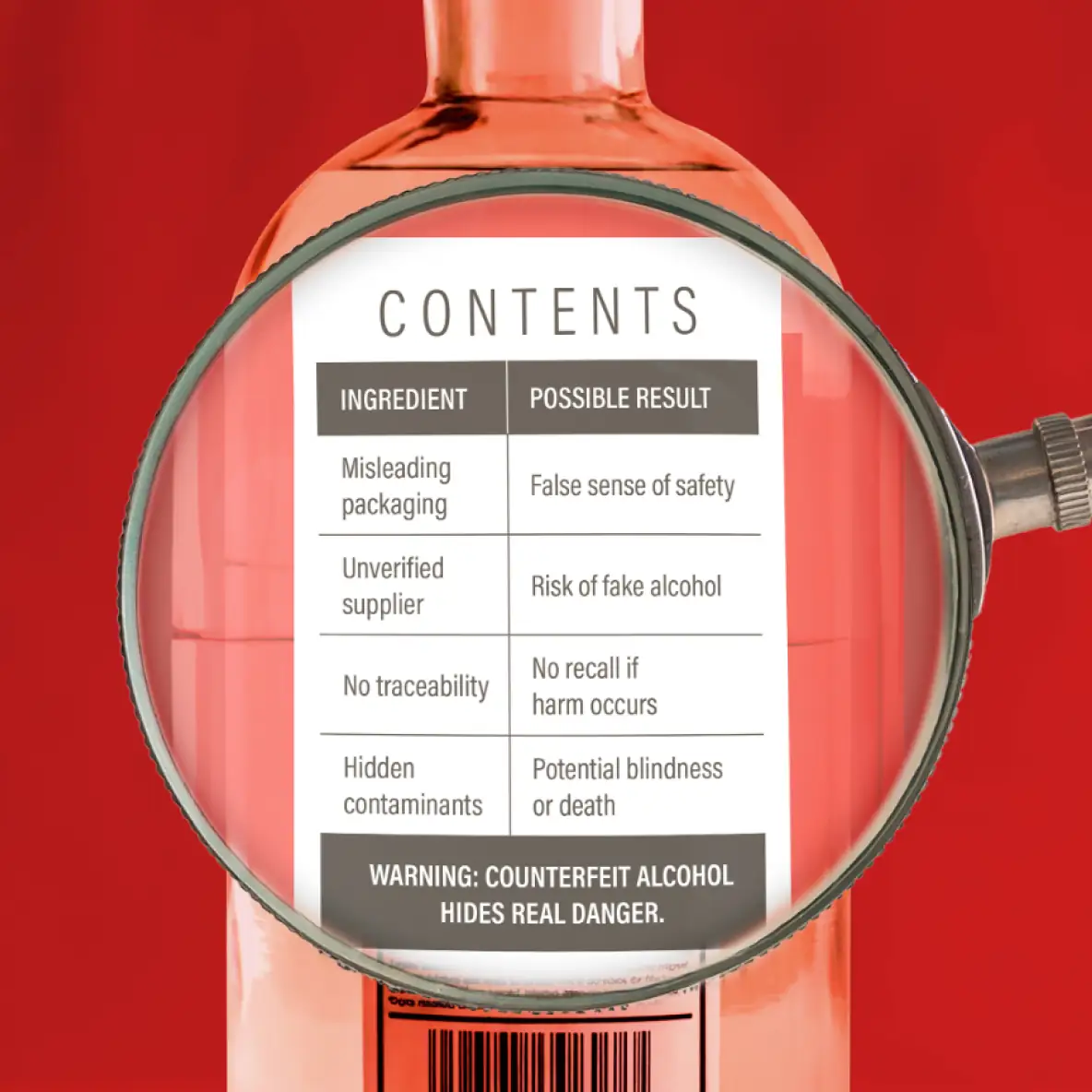 Counterfeit alcohol is dangerous. It can contain chemicals like methanol that put your health at serious risk, including blindness and organ failure.